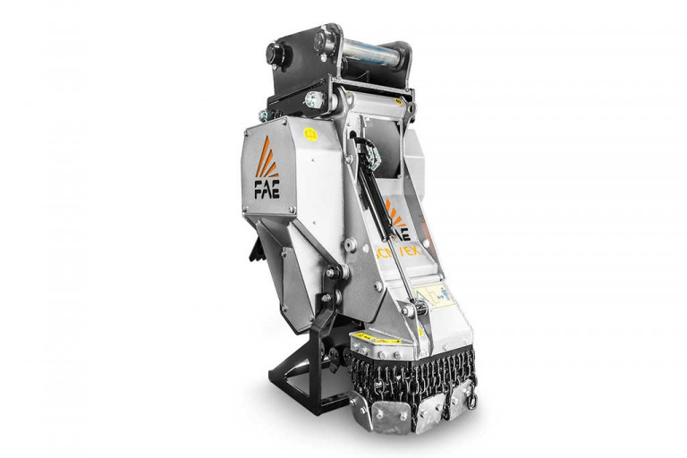 The new FAE SCM/EX/VT stump cutter satisfies the requirement of professional operators for quick and easy stump removal in nearly any situation. Equipped with exclusive features, this machine ensures the best results in a compact unit. The FAE SCM/EX/VT is supplied with a flow control system that allows it to fit different power excavators. The front hood with hydraulic adjustment and the special front fixed thumb guarantees very high performance and maximum safety. Thanks to the disk, reliable and easy to use special wheel, the stumps are simply swept away. The hydraulic adjustment of the front hood provides safer working conditions. The front fixed thumb is designed to move the cut material.