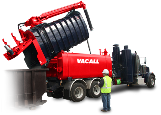 Vacall AllExcavate hydro excavators with high dump option enables operators to dump matieral into roll-off or other containers at the job site, rather than driving to off-site dumping locations.