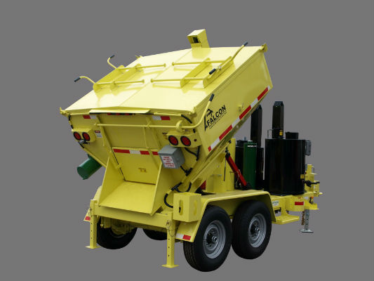 Falcon’s most popular asphalt recycler & hot box dumps asphalt with the push of a button. By lifting the hopper, the dump box makes offloading asphalt easy. To ensure stability when the hopper is raised, each dump box is built on a tandem axle trailer frame that cradles a lowered hopper using body guides to keep it centered. Dump box trailers are constructed with two hydraulic cylinders that raise the hopper and prevent twisting from an uneven load. With this design, each cylinder acts as a safety backup for the other.