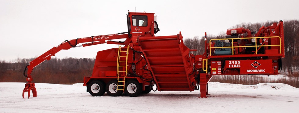 Whether used alone or in combination with a Morbark whole tree chipper to create a total fiber utilization system, the 2455 Stand-Alone Flail is built for maximized output. With three top feed rollers mounted on yoke assemblies, two stationary bottom feed rollers, and a bark discharge conveyor that folds for transport, this machine has many features perfect for whole tree chipping. The enclosed weatherized operator’s cab and color-tinted safety glass helps protect the operator.