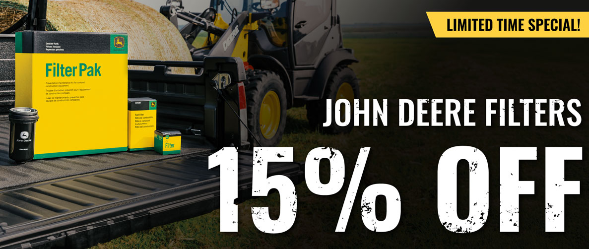 Offer valid on qualifying purchases made between November 1 and November 30, 2025. Discount Code: JDFILT. Get 15% off John Deere filters. Some exclusions may apply; see your Papé Machinery parts counter representative for full details.